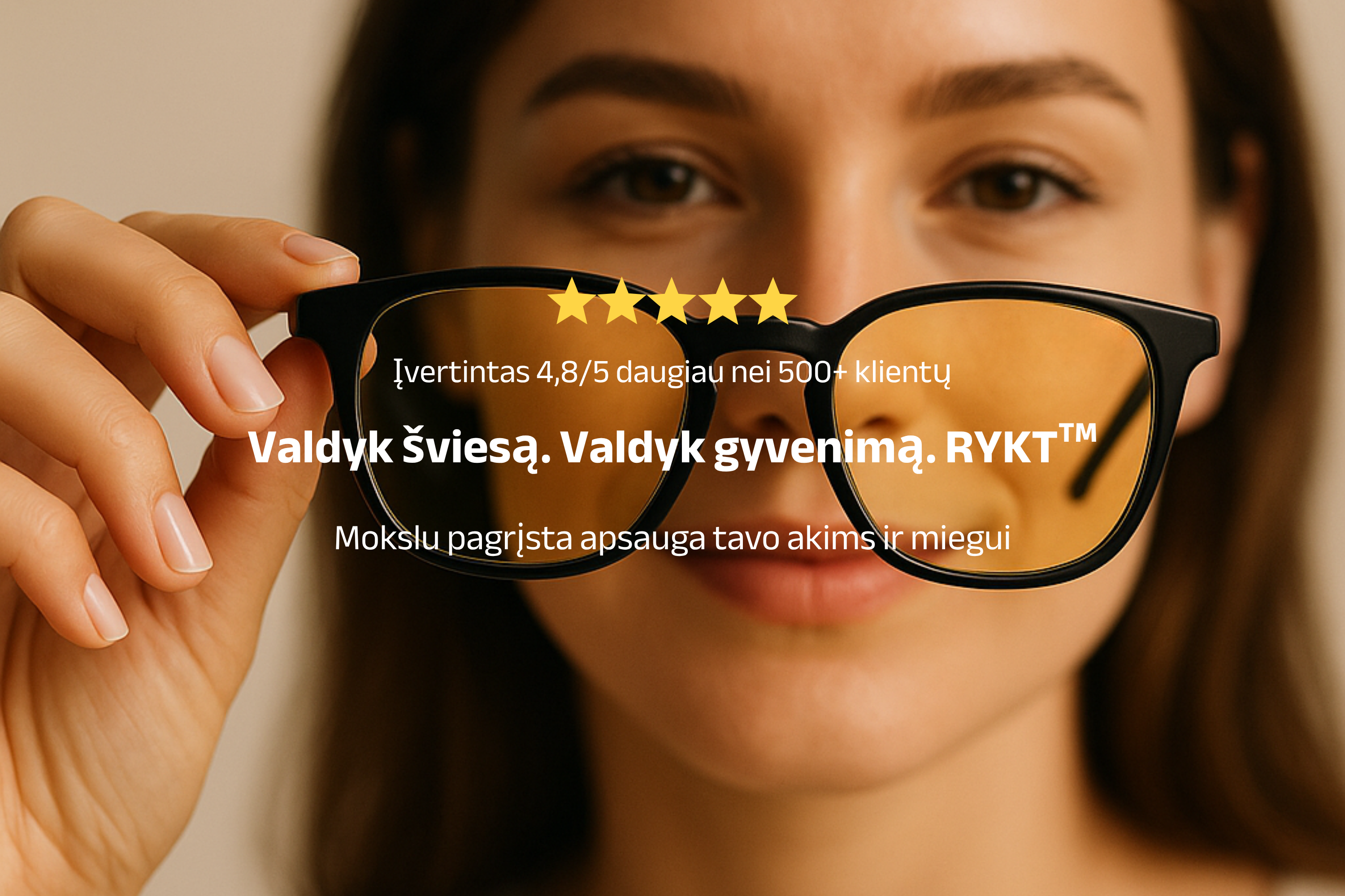 RYKT™ lęšiai blokuoja 95-100% žalingiausių mėlynos šviesos bangų ilgių (400-550nm) – patvirtinta laboratoriniais tyrimais ir moksliniais tyrimais.